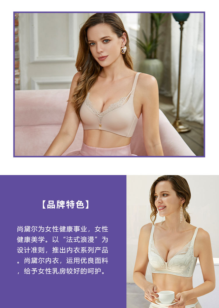 运用贴身舒适的面料、融合良好的制作工艺,传承法式内衣浪漫、优雅、设计理念,结合东西方文化的神韵,推出新款内衣产品。产品舒适健康、典雅,女性魅力四溢的迷人气质的同时,打造出女性终生的健康事业。