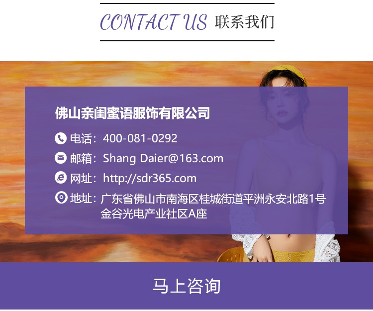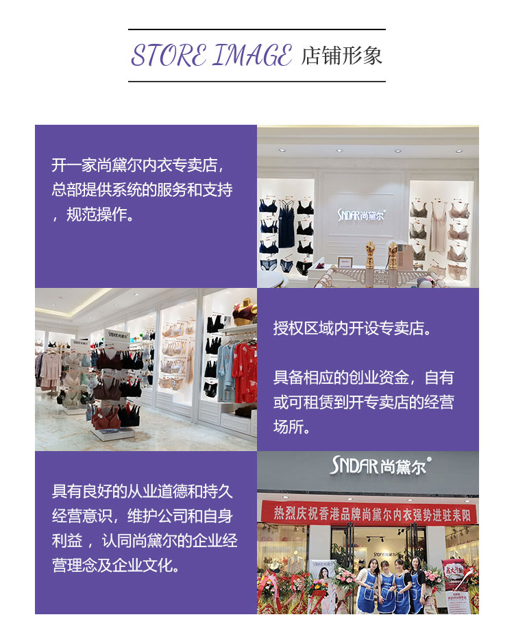 尚黛尔为女性设计出更多的健康舒适和优雅,打造出内衣销售体系。企业本着诚实互信、持续发展、合作双赢的经营原则,在全国发展各级专卖店及代理商,做内衣行业的品牌,实现跨越式发展的预期目标。